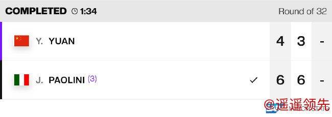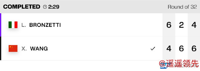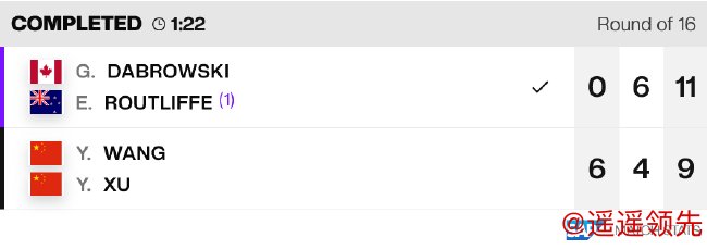 而在另外2场比赛中,王雅繁/徐一璠用时1小时22分钟,在先胜一盘的情况下,抢十错失赛点,最终以6-0/4-6/9-11遭头号种子、跨国组合达布劳斯基/卢特利芙逆转,止步16强。