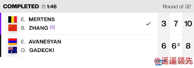女双方面,在女双首轮的一场比赛中,5号种子张帅/梅尔滕斯用时1小时46分钟,在先输一盘的情况下,最终以3-6/7-6(2)/10-8逆转跨国组合阿瓦涅相/盖德基,晋级16强。