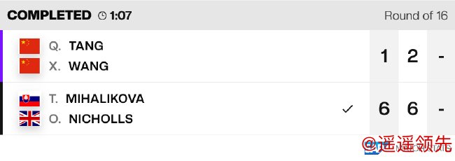 持外卡出战的汤千慧/王曦雨仅用时1小时07分钟,就连丢两盘,以1-6/2-6不敌跨国组合米哈利科娃/尼科尔斯,无缘晋级八强。