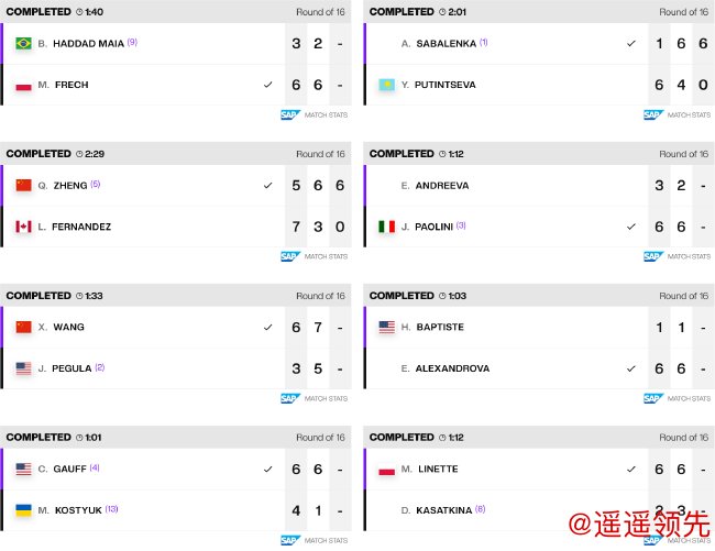 在晚场率先开始的一场比赛中,2届赛会冠军、头号种子萨巴伦卡耗时2小时01分钟,打满三盘,在先输一盘的情况下,连扳两盘,以1-6/6-4/6-0逆转哈萨克斯坦选手普丁塞娃,将在武网的战绩改写为14-0,职业生涯第24次打进1000赛八强。接下来,3届大满贯得主将对阵波兰选手弗莱彻。