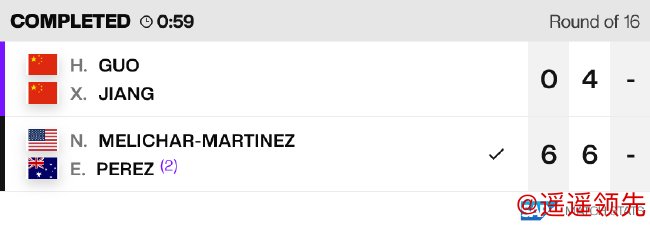 而在女双第二轮的一场比赛中,郭涵煜/蒋欣玗仅用时59分钟,就连丢两盘,以0-6/4-6不敌2号种子梅里查尔/佩雷兹,无缘晋级八强。