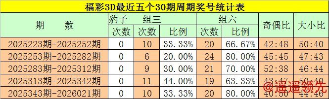 在最近一个30期周期内(第2025343期-第2026021期),豹子奖号没有出现,组三奖号开出了10次,所占比例为40%,组六奖号共出现20期,开云体育官网开出比例为80%,组六号码轮空4期,本期重点关注组六号码出现。