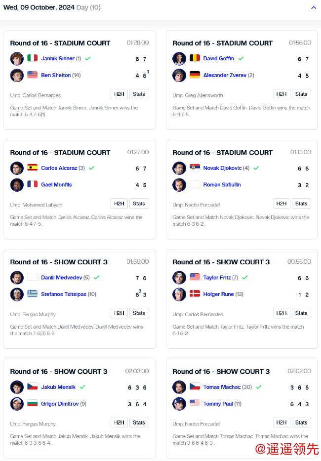 在男单正赛第四轮中,头号种子辛纳用时1小时28分钟,直落两盘,以6-4/7-6(1)战胜14号种子谢尔顿,闯进正赛八强。在1/4决赛中,意大利人将对阵5号种子梅德韦德夫——后者用时1小时50分钟,连胜两盘,以7-6(3)/6-3击败老对手、10号种子西西帕斯,取得对其3连胜,九游娱乐下载并打进本赛季第9个巡回赛八强。