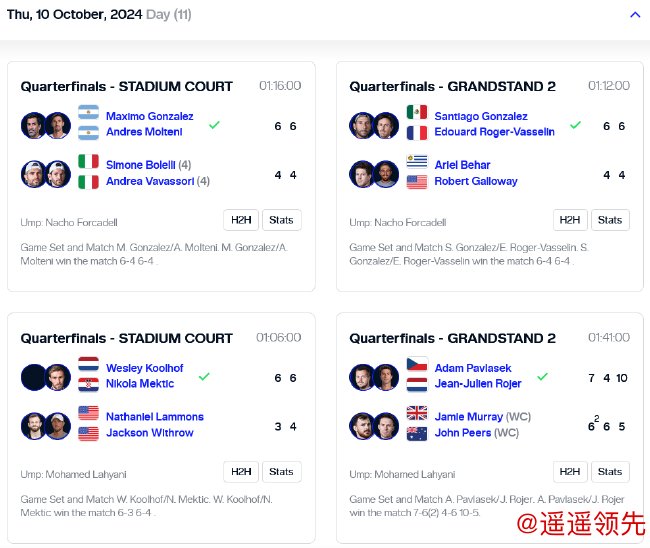在正赛第九日中,共进行了2场男单1/4决赛和4场男双1/4决赛。