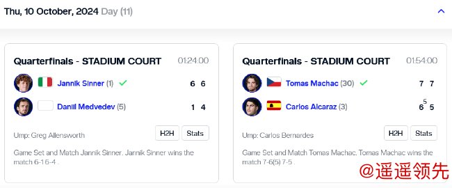在稍后进行的第2场男单1/4决赛中,3号种子阿尔卡拉斯对阵30号种子马哈奇。比赛中,双方打得较为胶着,首盘就战至抢七,才分出胜负,第二盘中,捷克新星又是在盘末关键时刻完成破发,最终,马哈奇耗时1小时54分钟,连下两城,以7-6(5)/7-5力克西班牙人,首次跻身大师赛四强,终结对手美网后的12连胜。半决赛中,他将挑战世界第一辛纳。